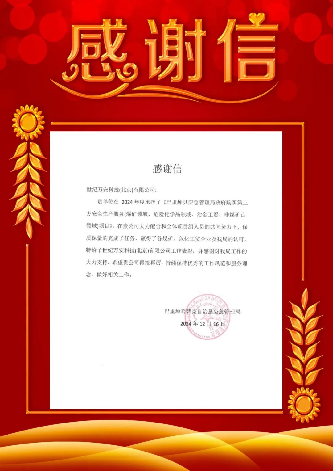 世紀(jì)萬安公司助力巴里坤縣安全生產(chǎn)提升 應(yīng)急管理局致函感謝